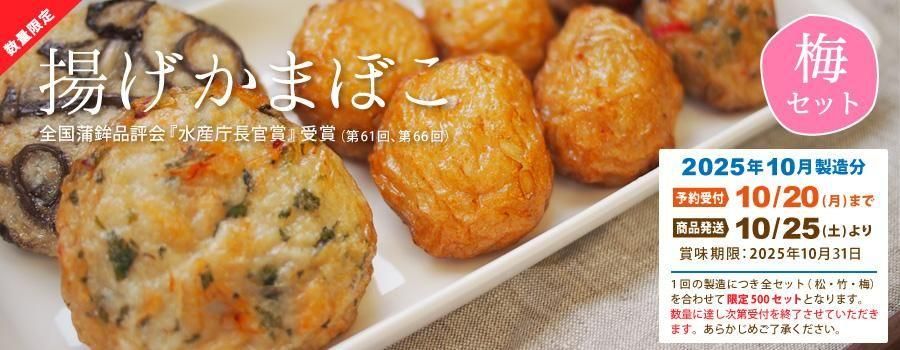 ※ご注意※ ●こちらの商品は、賞味期限が決まっている商品となります。商品ページをご確認のうえ、ご購入ください。 ●揚げかまぼこは、1回の製造につき全セット(松・竹・梅)を合わせて限定500セットとなります。 ●ご注文の締切日に関わらず、合計500セットに達した時点で受付を終了させていただきます。